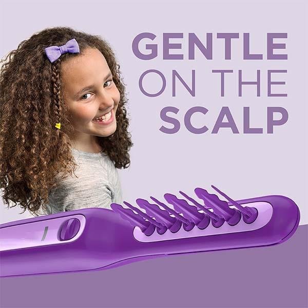 - Gentle on the Scalp: The soft tip teeth protect the scalp while preventing pulling or tugging of hair; Cordless: Enjoy cordless convenience with this battery-powered brush (two AA batteries included); On/Off Switch: Easy operation so kids can detangle on their own.